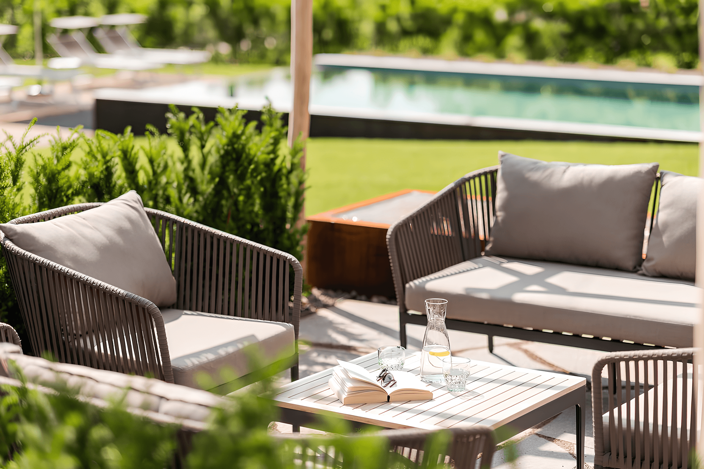 Entspannen Sie in unserer mediterranen Gartenoase mit Infinity-Naturbad und Kinderbecken inmitten der malerischen Weinberglandschaft.